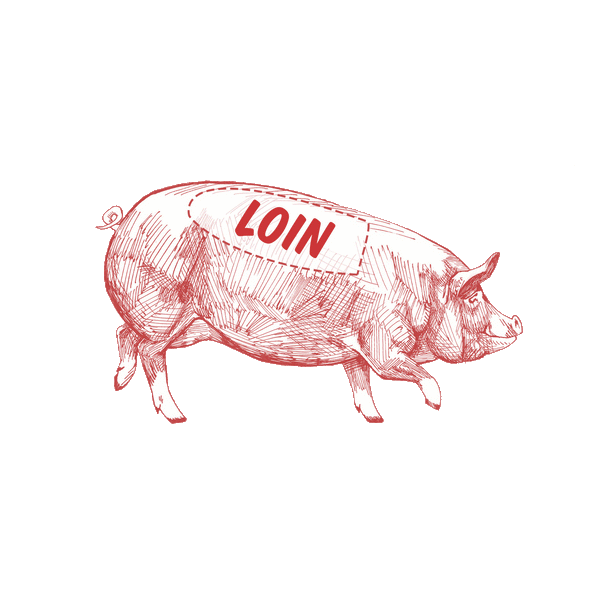 The most prime cut of the pig, the whole loin includes many individual cuts. Starting on the shoulder end lies the country rib roast: part shoulder, part chop. The center-cut loin, the most recognizable cut in the butcher case, is available bone-in, boneless, and cut into chops. Our top seller, the porterhouse or T-bone, connects to the back end of the loin and includes the coveted tenderloin. Medallions, loin bacon, back fat, skin, and even the baby back rib come from this most tender and juicy top section of the pig.